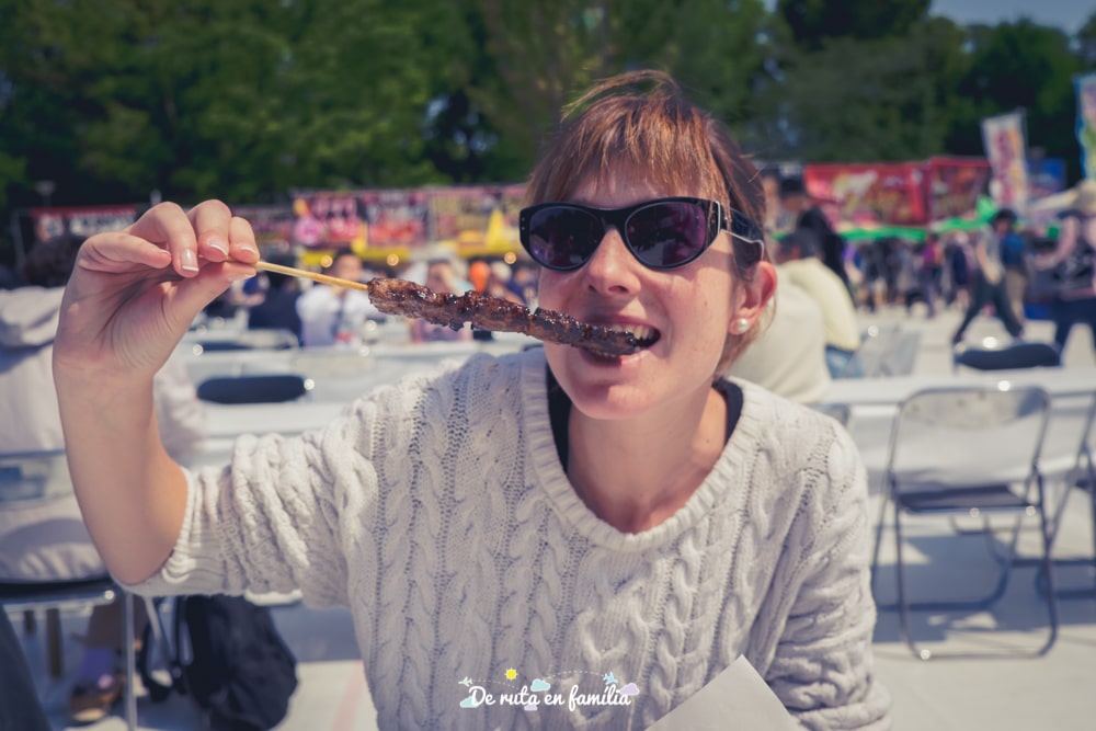 Nosaltres hi vam arribar amb la intenció de buscar algun lloc per dinar, però no sé si era el cansament que ja començava a ser molt evident que ens vam atabalar una mica i vam fer mitja volta per tornar al centre del parc on hi havia una mena de fira plena de paradetes de menjar tradicional, així que vam agafar els nostres primers yakitori i un okonomiyaki i vam fer com tota la resta de japonesos que hi havia per allí: menjar al bell mig del Parc Ueno.