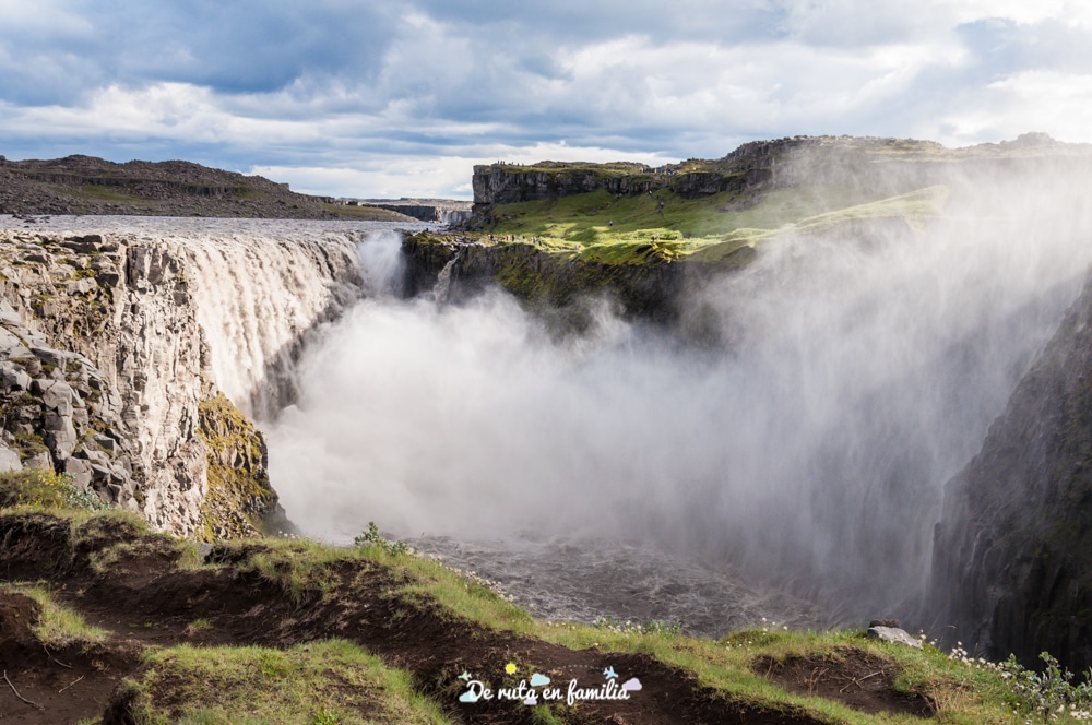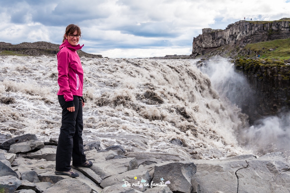 Dettifoss es posiblemente una de las cascadas más espectaculares que veréis en vuestra vida y lo mejor de todo es que puedes acercarte una barbaridad, hasta tocar el agua con las manos (con mucha prudencia, obviamente). Sólo tiene 44 metros de altura, pero cada segundo caen más de 190 metros cúbicos de agua, que hacen que el rocío se vea desde un kilómetro de distancia. El ruido que hace es ensordecedor y ver la cantidad de agua que cae cada segundo te deja sin palabras.