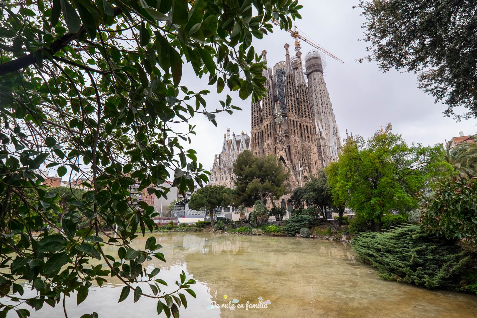Os recomendamos esperar a que oscurezca y contemplarla desde la plaza Gaudí, ubicada junto a una de sus naves laterales, ya que en el agua del pequeño estanque se crea un reflejo espectacular del templo.