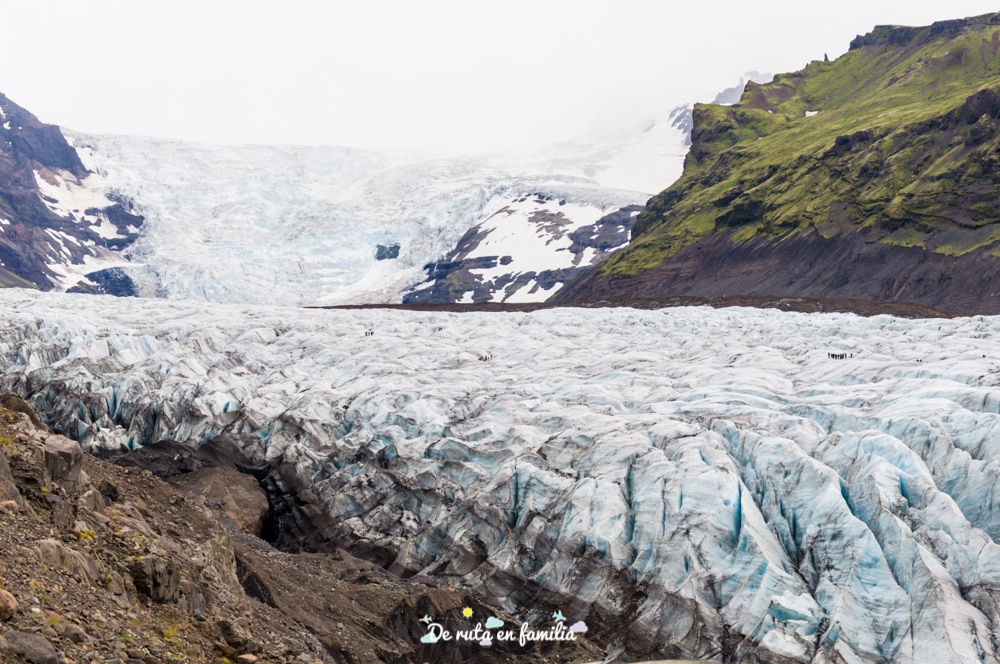 Entonces seguimos en dirección hacia el centro de visitas del Parque Nacional Skaftafell desde donde salen una infinidad de excursiones por la región. Durante el camino, lluvia, lluvia y más lluvia, pero cuando nos estábamos acercando a una de las lenguas del glaciar que toca más en la carretera el día se abrió un poco y pudimos acercarnos a ella para verla desde de cerca. Todo un lujo!