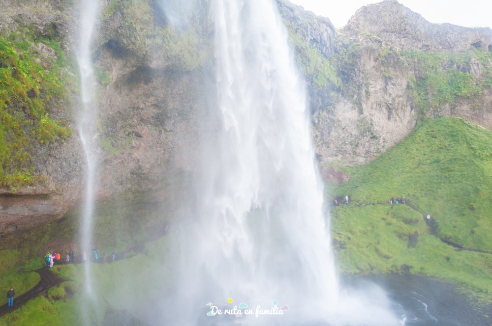 La siguiente parada, a unos 20 kilómetros de Skogarfoss, era la cascada Seljalandsfoss, con una caída de 60 metros. La cascada en sí no es nada del otro mundo y menos teniendo en cuenta todas las que ya habíamos visto, pero vale la pena ir porque hay un pequeño sendero que permite caminar por detrás del salto del agua.