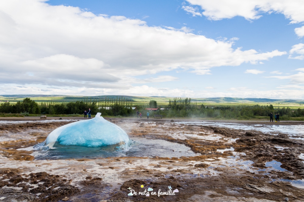 Sin embargo, el gran atractivo es el Strokkur, el géiser más fiable del mundo y que está justo a su lado. Suele salir cada siete u ocho minutos y puede llegar hasta unos 30 metros de altura. Es importante no ponerse en la dirección del viento si uno no quiere acabar empapado de arriba a abajo.