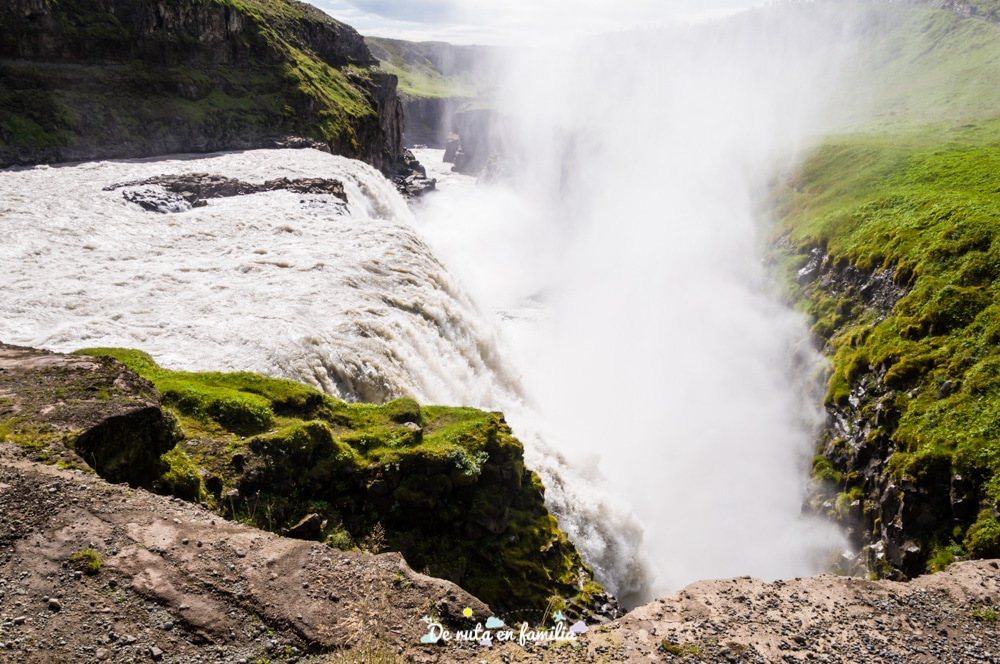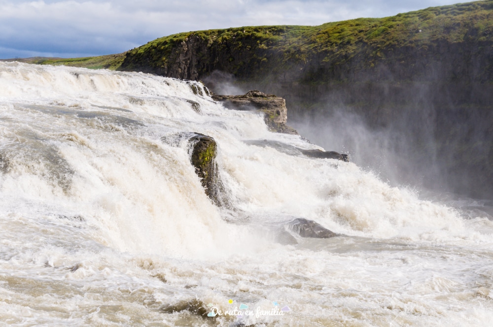 Así pues, la primera parada fue Gullfoss, la cascada más famosa de la isla. Tiene una caída de 32 metros que crea una pared de rocío antes de desaparecer por un estrecho barranco con un ruido ensordecedor. Si hay niebla el segundo nivel puede quedar tapado y hacer perder mucha espectacularidad en la cascada.