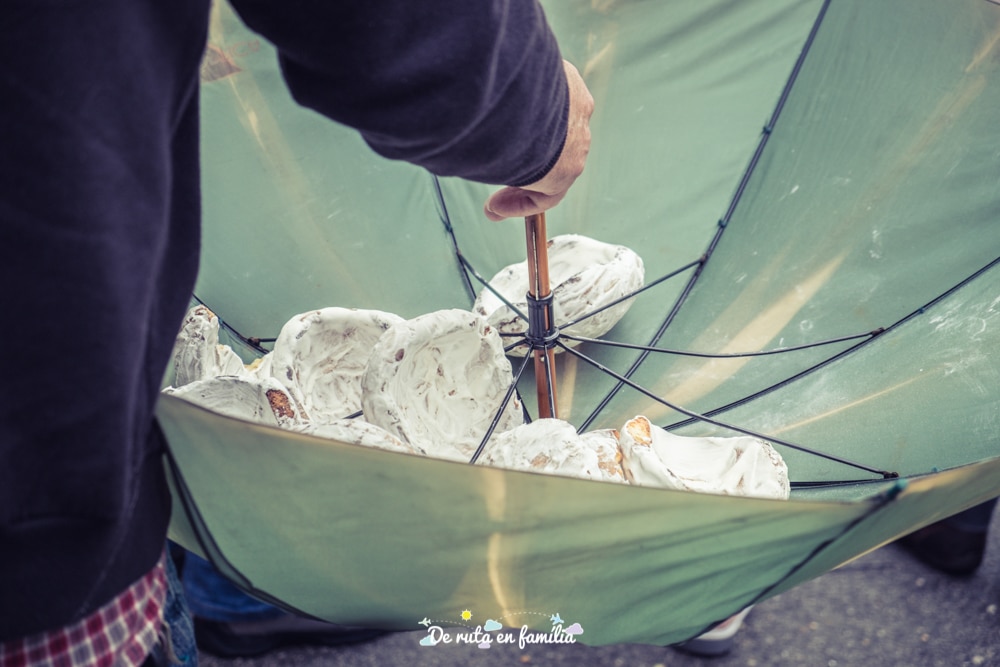 Allí hi havia gent amb bosses de brossa d’aquestes industrials plenes fins dalt! Nosaltres, tot i la nostra poca pràctica, vam poder arreplegar-ne un parell i descobrir que aquells dolços eren com una mena de pans recoberts de merengue (bastant espesos, la veritat).