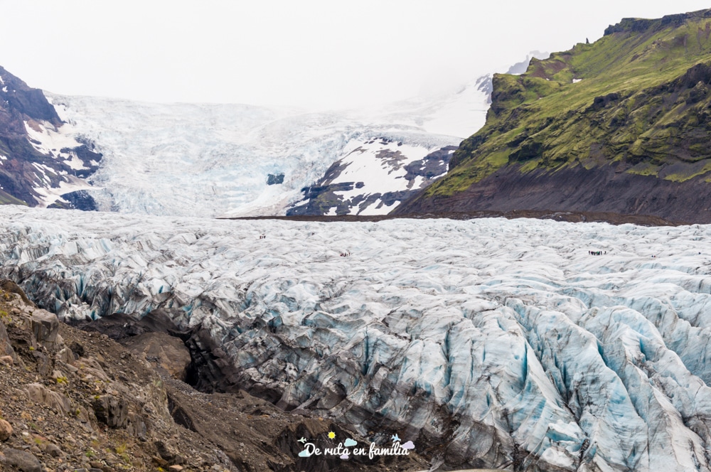 Llavors vam seguir en direcció cap al centre de visites del Parc Nacional Skaftafell, des d’on surten una infinitat d’excursions per la regió. Durant el camí, pluja, pluja i més pluja, però quan ens estàvem acostant a una de les llengües de la glacera que toca més a la carretera el dia es va obrir una mica i vam poder acostar-nos-hi per veure-la des d’aprop. Tot un luxe!